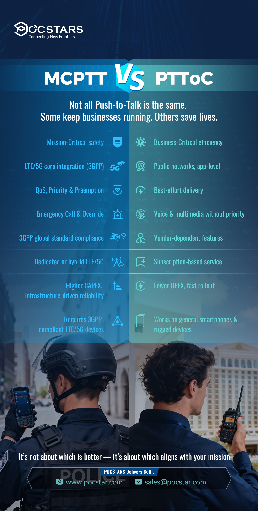 While both deliver Push-to-Talk over broadband, PTToC and MCPTT differ in purpose, technology, cost, and device requirements.